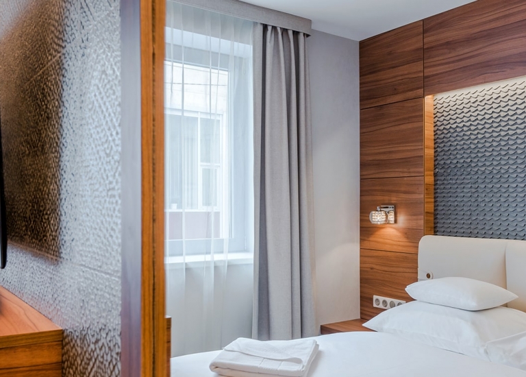 Szobáink mindegyike a mai városi design követelményeinek és kényelmi szempontjainak megfelelően került kialakításra, egyszerű, letisztult stílussal és meleg, barátságos színvilággal, valamint a szálloda egyediségének figyelembe vételével.